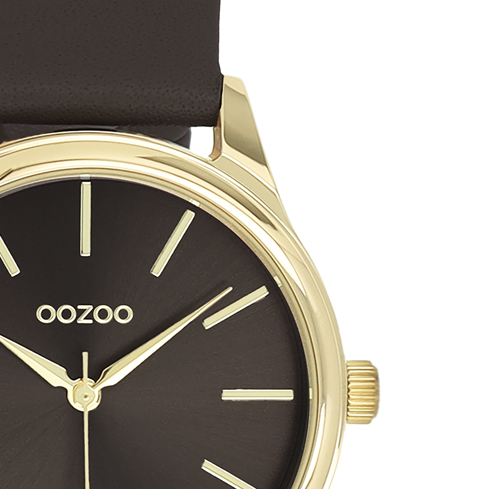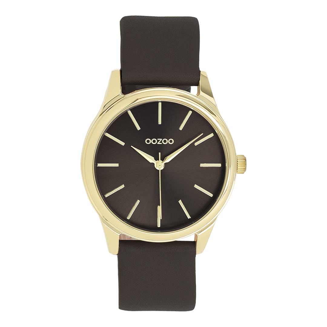 Gold coloured OOZOO watch with dark brown leather strap - C11678