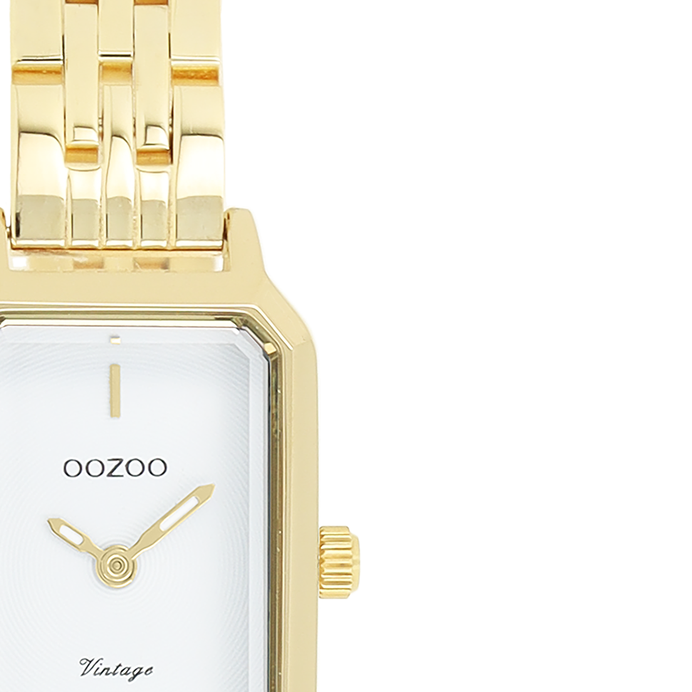 The classic look stays key in this trendy series and therefore, this rectangle OOZOO vintage design with a playful wink is the season must-have! This ladies watch is the perfect combination of fashion and comfort with its 22x19 mm gold coloured metal watch case and white dial. The shiny gold coloured stainless steel bracelet makes this watch a trendy accessory, which you can wear every day. The dial has gold coloured stripes digits and matching hands. The C20427 adds the sparkle to your outfit. The mineral glass lays in a mm slim metal watch case with IP-plating. This design has a stainless steel backplate and is nickel safe. This watch has a 2ATM Japanese movement and is covered by a 2 year warranty (see section 3 of our Refund, shipping & warranty policy).