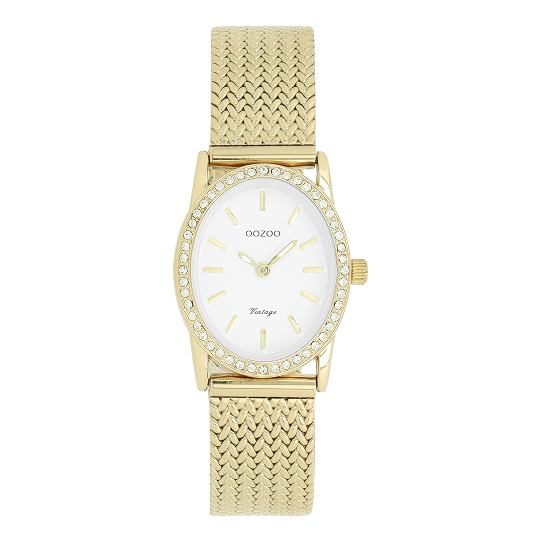 The classic look stays key in this trendy series and therefore, this oval OOZOO vintage design with a playful wink is the season must-have! This ladies watch is the perfect combination of fashion and comfort with its 28x23 mm gold coloured metal with crystals watch case and white dial. The gold coloured metal v-mesh bracelet makes this watch a trendy accessory, which you can wear every day. The dial has gold coloured stripes digits and matching hands. The C20432 adds the sparkle to your outfit. The mineral glass lays in a mm slim metal watch case with IP-plating. This design has a stainless steel backplate and is nickel safe. This watch has a 2ATM Japanese movement and is covered by a 2 year warranty (see section 3 of our Refund, shipping & warranty policy).