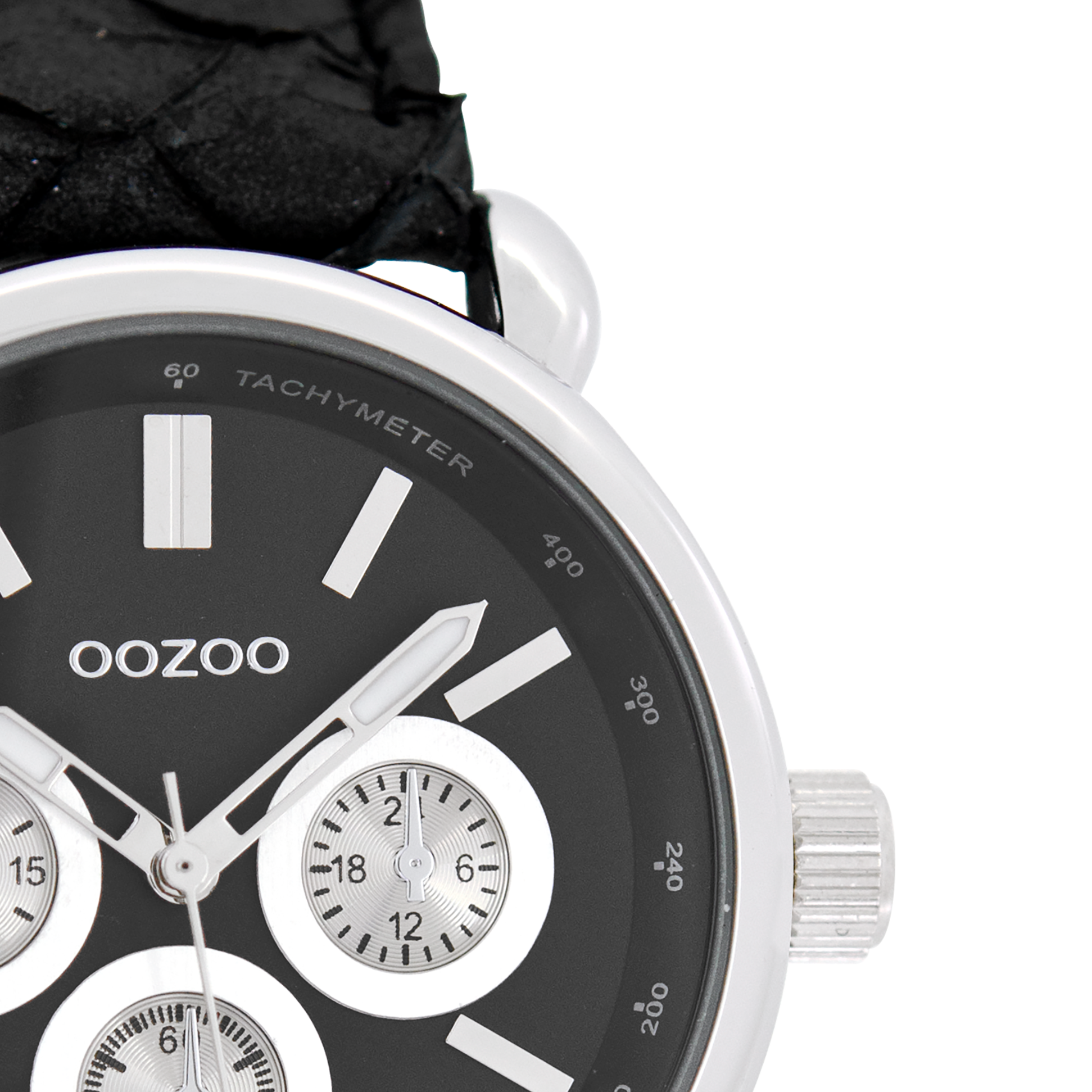Stand out with this beautiful round ladies design from the trendy OOZOO Timepieces collection. The C7139 has a snake black leather strap and 45 mm silver coloured metal watch case. You are making quite the fashion statement with this black chrono dial, silver coloured stripes digits and matching hands. This essential watch for your wardrobe has a mineral glass, stainless steel backplate and is nickel safe. This watch has a 2 Japanese movement and is covered by a 2 year warranty (see section 3 of our Refund, shipping & warranty policy).