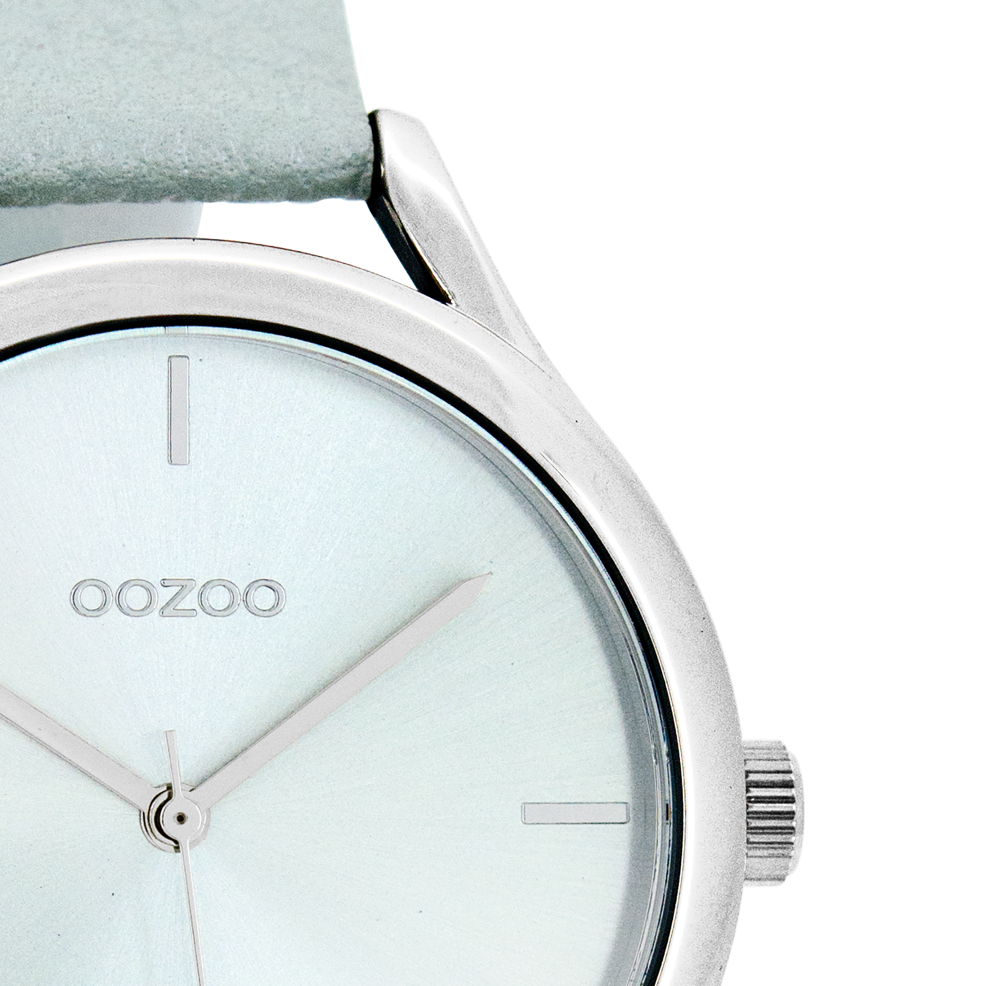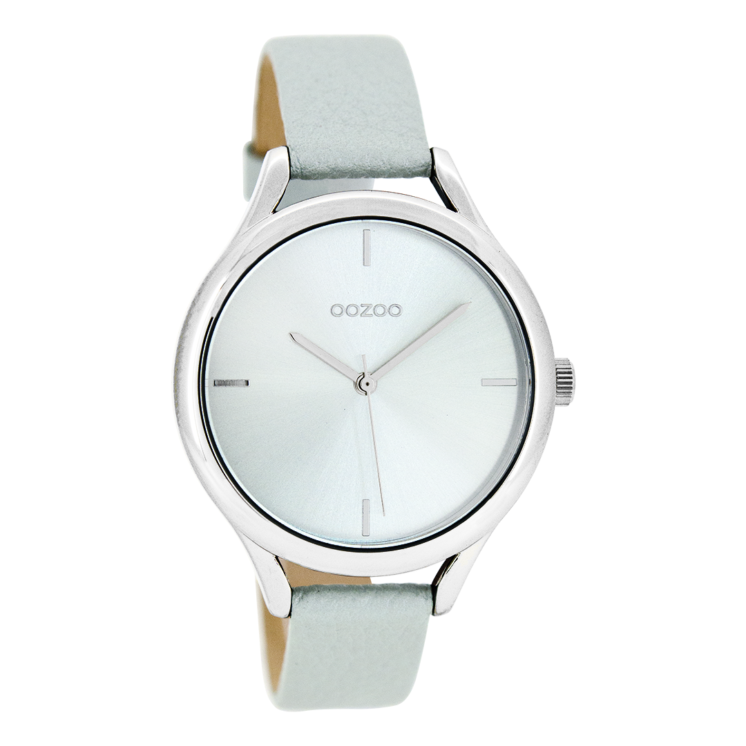 Silver coloured OOZOO watch with light blue leather strap - C8346