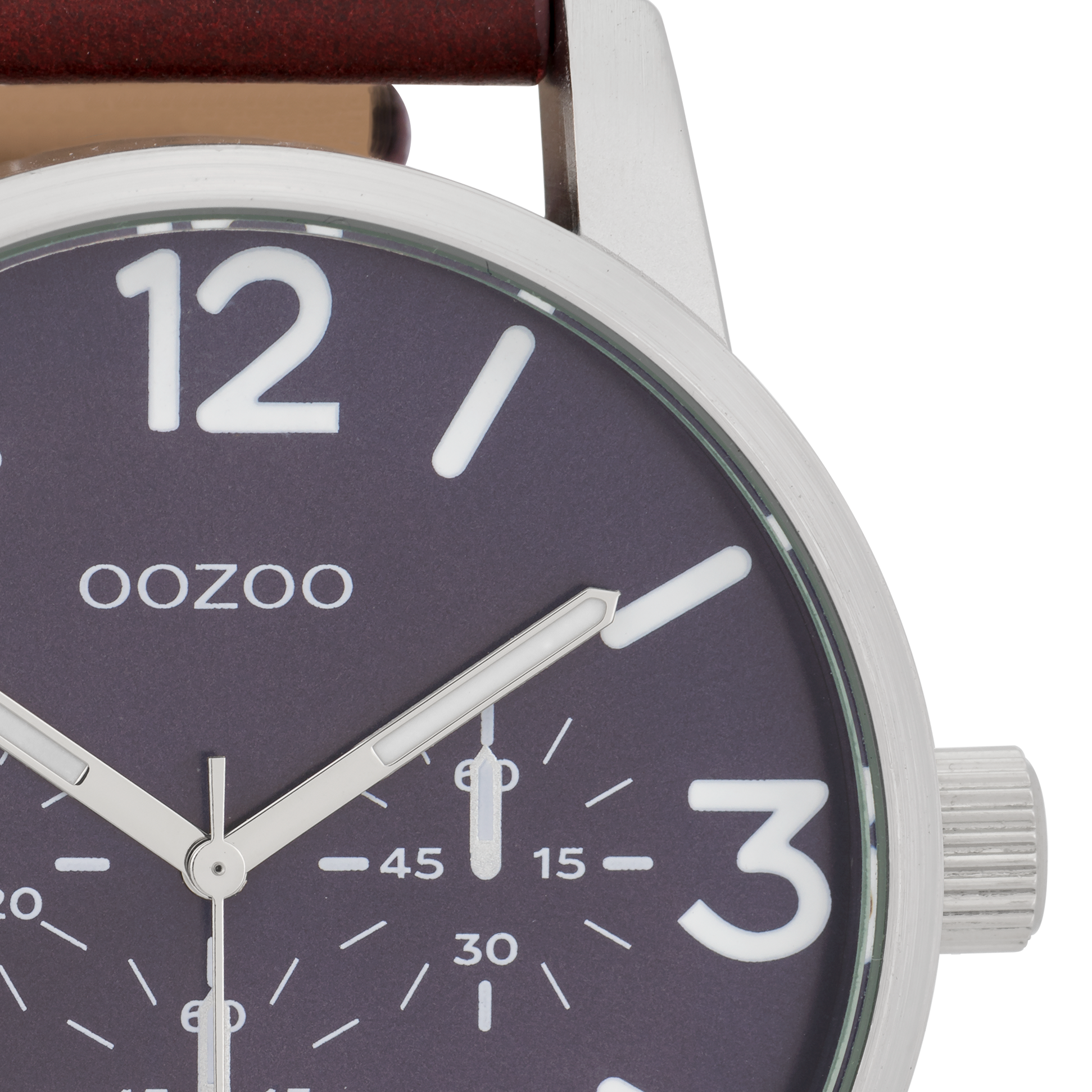 Silver coloured OOZOO watch with red brown leather strap - C9651